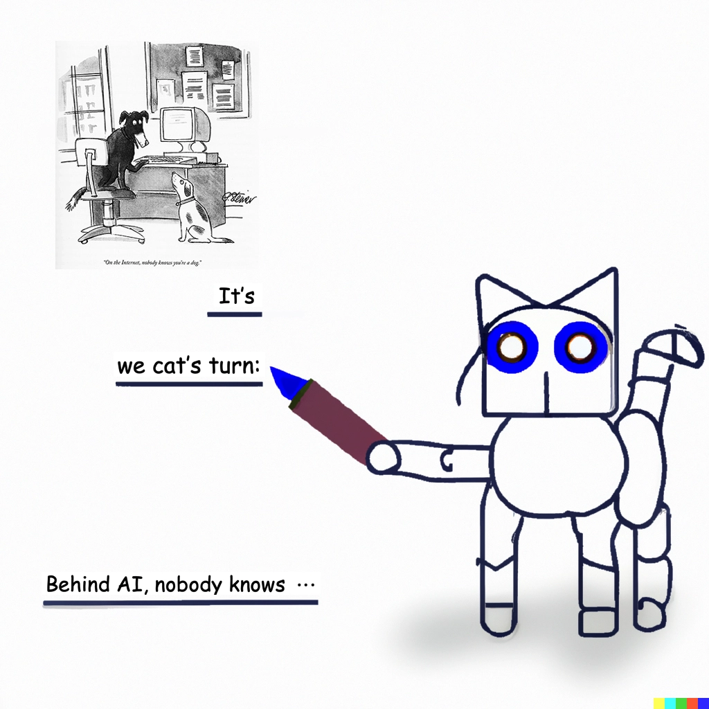 影像來源:DALL·E 2 + Eric Chung / 影像左上角插圖:Nobody knows you’re a dog, by Peter Steiner, published on the New Yorker, July 5th, 1993