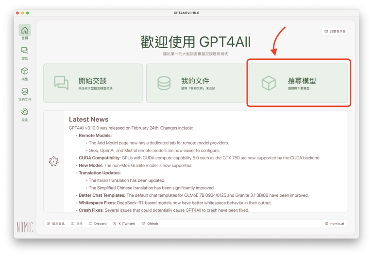 GPT4All 支援 Windows、macOS、Linux (Ubuntu),也內建繁體中文介面,使用者可以依照自己電腦的作業系統下載相應的版本