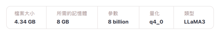 • 「參數」(parameters):這是該語言模型的參數量,這裡的8 billion 就是80億個參數,若是4 billion就是40億個參數,以此類推。理論上,參數越大能力越強,但執行時的硬體規格要求也越高。