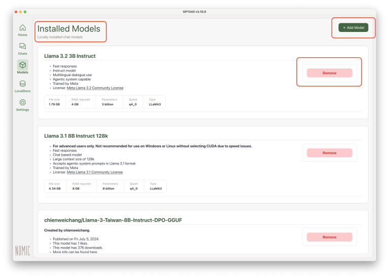 如果不打算繼續使用已經下載的特定模型,可以按一下該模型右方的「移除」(remove),就可以從電腦上刪除該模型的檔案,以節省電腦儲存空間。如果要再新增模型,可以按一下右上角的「+新增模型」(Add Model),就會進入前文所提到的「探索模型」和模型列表,可以從清單中挑選新的模型。