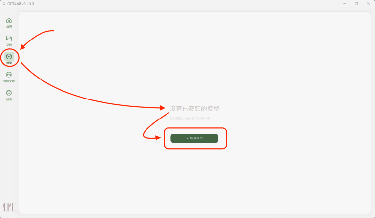 如果還沒有任何已下載的模型,則顯示「沒有已安裝的模型」,只要按一下「+新增模型」(Add Model),就會進入前文所提到的「探索模型」和模型列表,可以從清單中挑選新的模型: