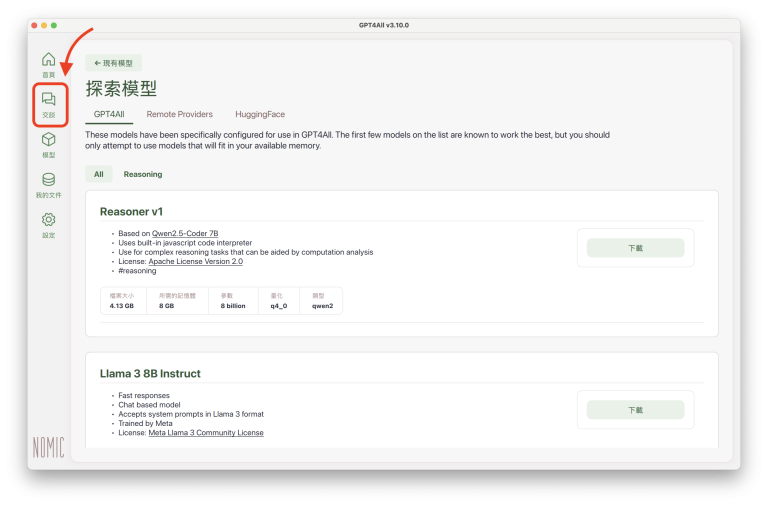 LLM 模型下載完成後,點擊左方側邊欄的「交談」(Chat):