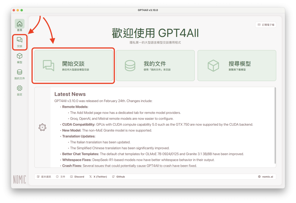 點選GPT4All軟體首頁的「開始交談」、或左方側邊欄的「交談」: