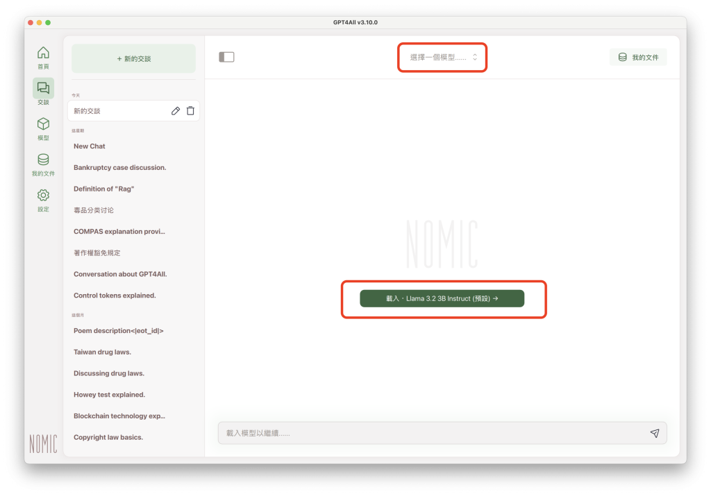 點擊中央的綠色按鈕,會載入之前已下載的LLM。這裡所謂的「載入」(load),是指匯入本次交談所要使用的LLM。因為GPT4All可以下載二個以上的LLM(但要注意硬碟空間是否足夠),每次交談時都可以從已下載的LLM選單中,選擇本次交談所要使用的LLM。