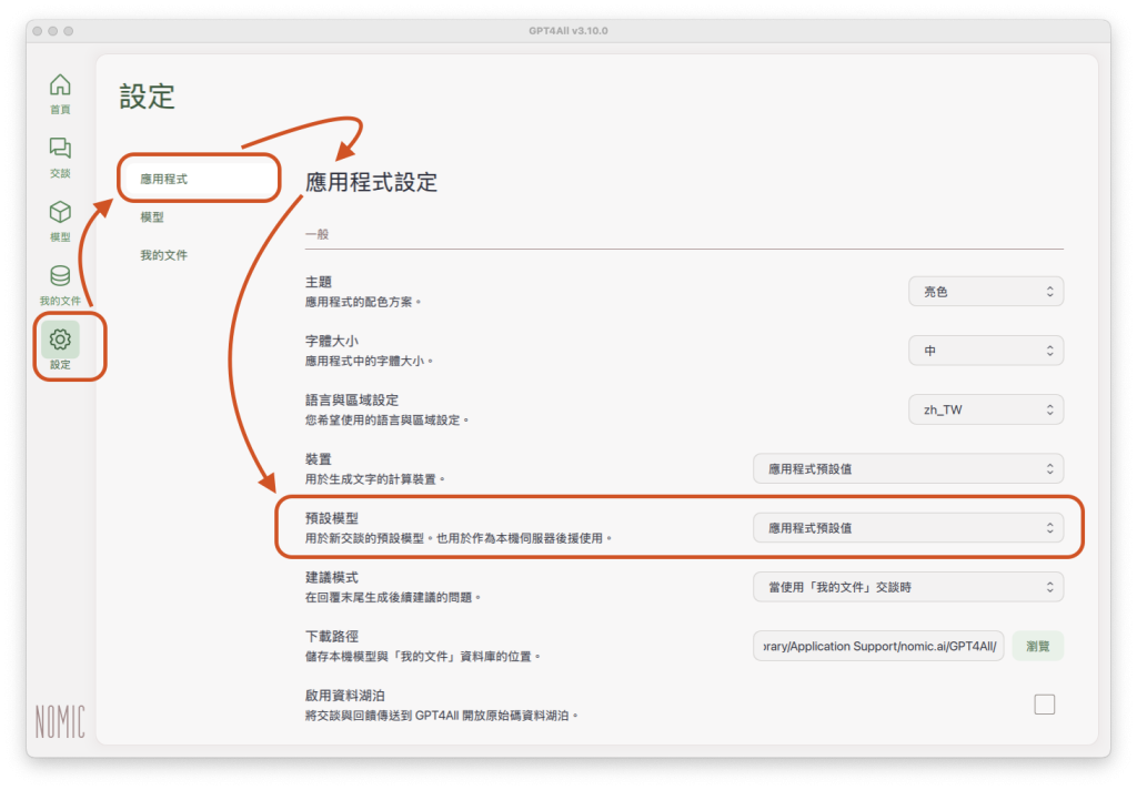 如果之前已經下載過二個以上的LLM,可以在左方側邊欄「設定」>「應用程式」>「預設模型」中,設定將來交談時預設使用的LLM: