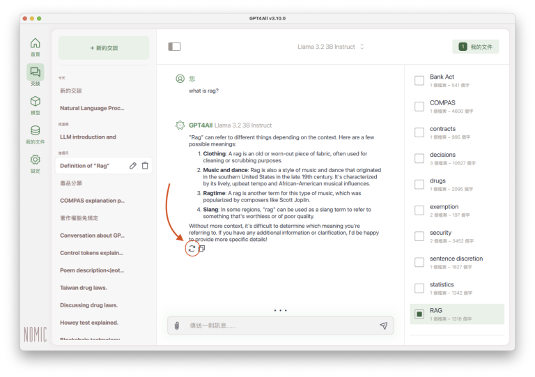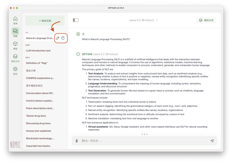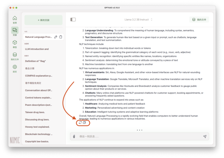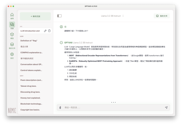 GPT4All交談的使用方式,和ChatGPT、Gemini的使用方式一樣,採問答的方式進行: