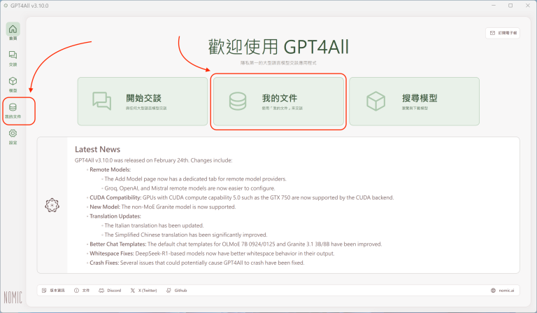 在GPT4All軟體首頁,點選正中央的「我的文件」(LocalDocs)、或左方側邊欄的「我的文件」: