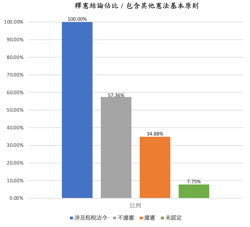 在全部129則涉及租稅法令的釋字解釋中,總計有72則在解釋理由中直接提及憲法第19條或租稅法律主義作為主要的指引原則、或其中之一的指引原則,比例為55.81%。