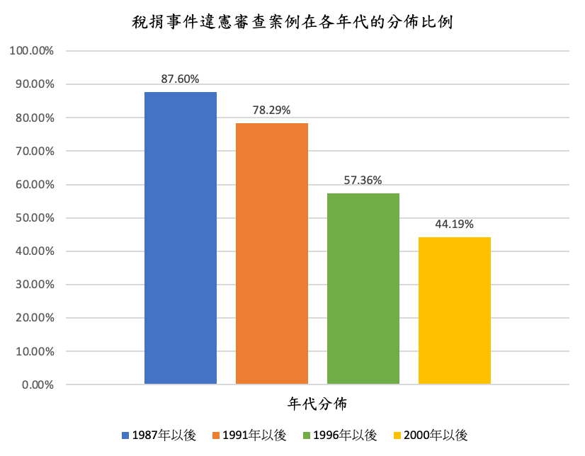 從1949年起至2021年止,在129則與稅務法令有關的釋字解釋之中,解釋日期在1987以前的案例,只有16則(12.40%),將近九成(87.60%)的稅捐違憲審查案例,是在1987年解嚴之後才做成解釋;即使將時間稍微往後移至1991年終止動員戡亂時期、制定公布憲法增修條文之後,也將近八成(78.29%),再往後延至1996年第一次總統直選之後,仍然超過半數(57.36%)。