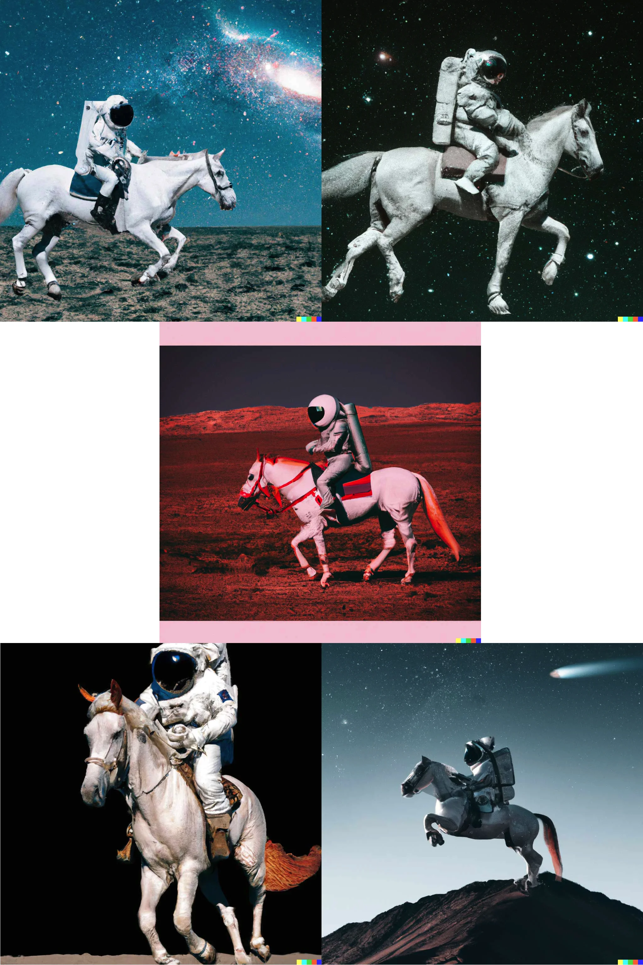 不過,在ChatGPT之前,OpenAI 所推出的 DALL·E 2 就已經令人感到驚訝,使用者只要輸入簡單的文字提示(prompt),就可以透過 AI 產生高品質的圖像。以 DALL·E 2 官網首頁的展示為例,輸入“An astronaut riding a horse in photorealistic style.”後,DALL·E 2 自動產生以下圖像:
