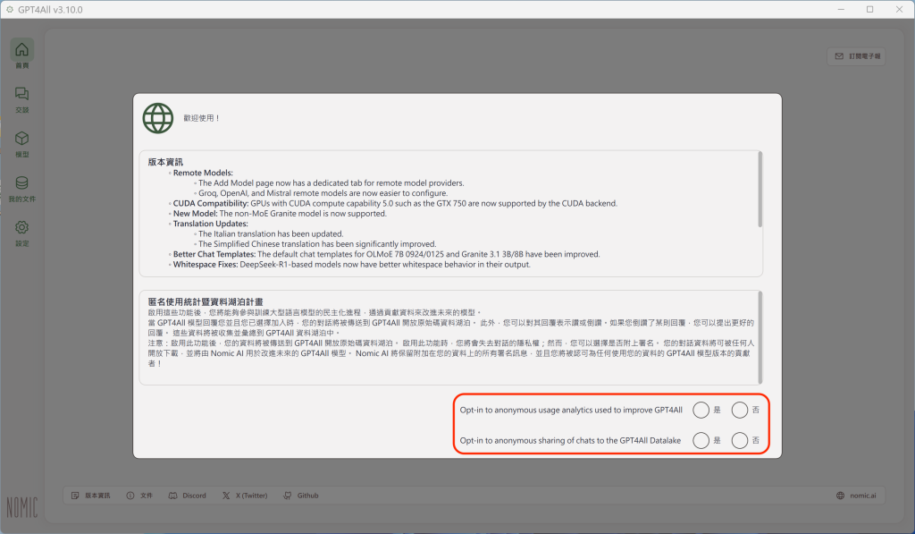 這二個選項都可以依照自己的意願,選擇「是」或「否」;如果不打算回傳軟體使用情形的分析資料和聊天記錄,可以選擇「否」。接著就會出現 GPT4All 首頁(Home):