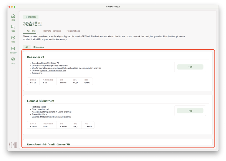 這是預設選項,列表中的大型語言模型都可以直接下載(按一下「下載」按鈕即可),而且都已事先完成相關設置、可以在 GPT4All 中執行。如果是剛接觸 LLM 模型或 RAG,可以先從清單中挑選檔案較小的模型,下載所需時間較短、執行速度也比較快,熟悉相關操作方式之後,再試用其他規格較大的模型。