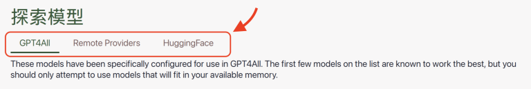 在「探索模型」下方,有三個標籤:「GPT4All」、「Remote Providers」、「Hugging Face」: