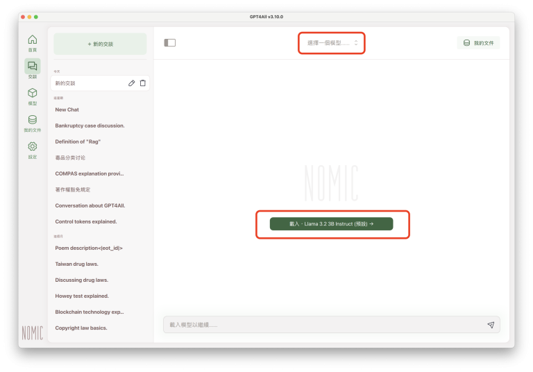 點擊中央的綠色按鈕,會載入已下載的大型語言模型。