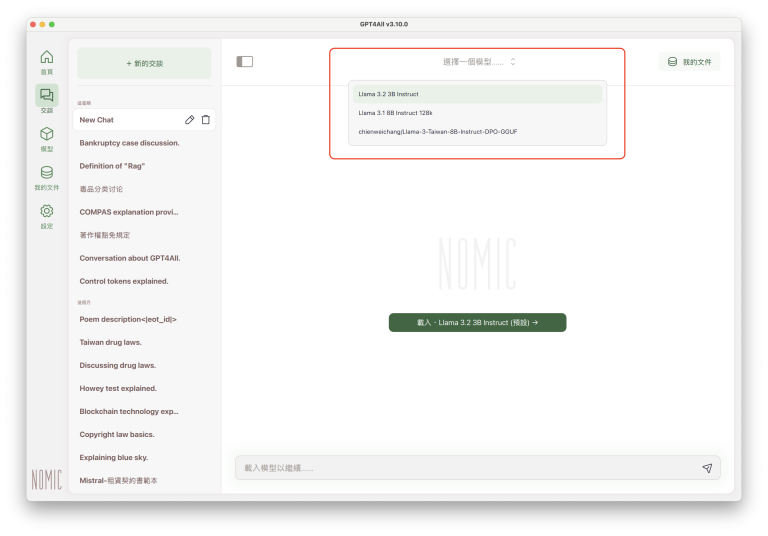 每次開啟交談時,如果不想使用預設的LLM,可以點一下畫面上方的「選擇一個模型……」,就會出現已下載的LLM選單,可以從選單中選擇要載入的大型語言模型(只是從已經下載的LLM中選擇,不會重新下載):