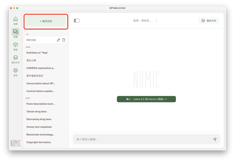 點擊中央的綠色按鈕,會載入之前已下載的LLM。這裡所謂的「載入」(load),是指匯入本次交談所要使用的LLM。因為GPT4All可以下載二個以上的LLM(但要注意硬碟空間是否足夠),每次交談時都可以從已下載的LLM選單中,選擇本次交談所要使用的LLM。