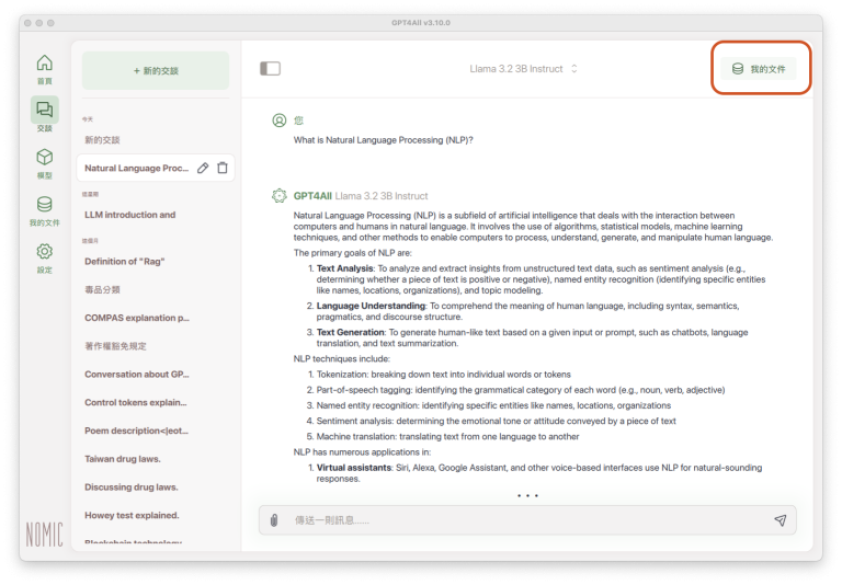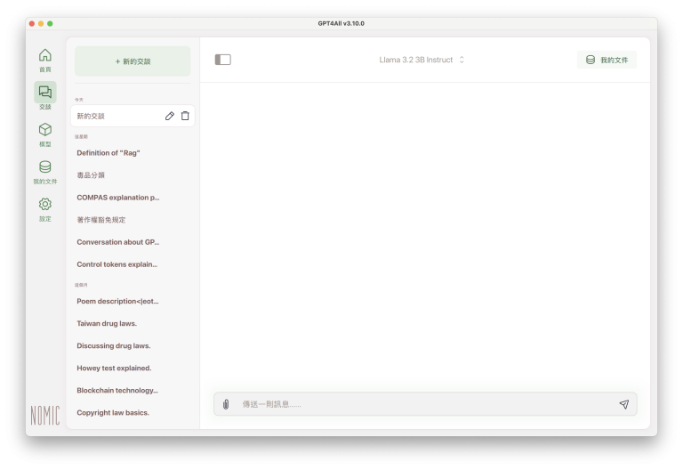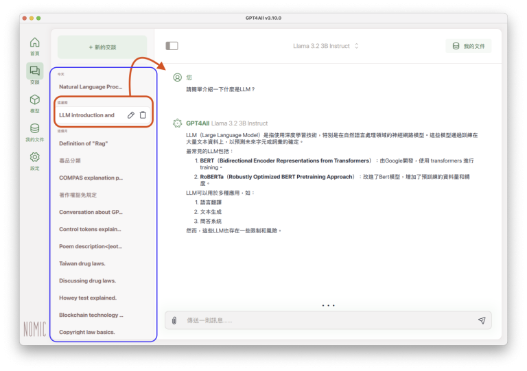 GPT4All交談的使用方式,和ChatGPT、Gemini的使用方式一樣,採問答的方式進行: