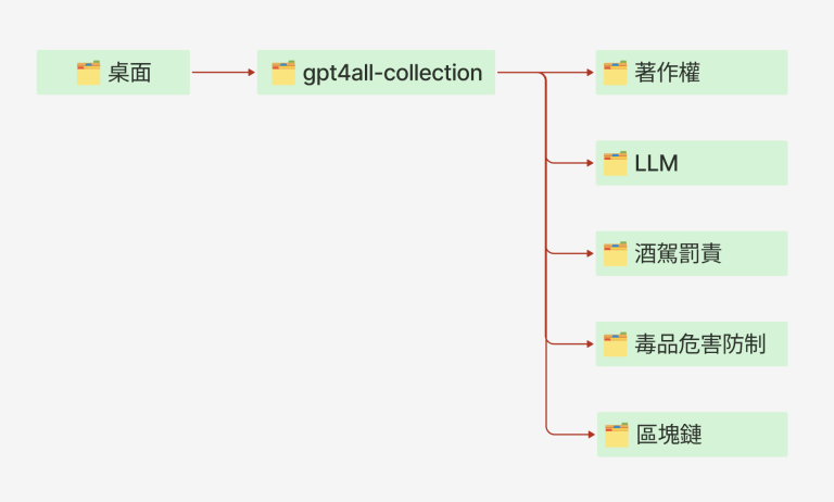 剛開始,建議先在電腦桌面上建立一個資料夾,例如「gpt4all-collection」,接著,在這個資料夾裡為每個有興趣的主題、或同一個主題但不同資料型態,再建立一個獨立的資料夾,例如著作權、LLM、酒駕罰則、毒品危害防制、區塊鏈等,完成後,桌面上「gpt4all-collection」的資料夾結構會類似下圖: