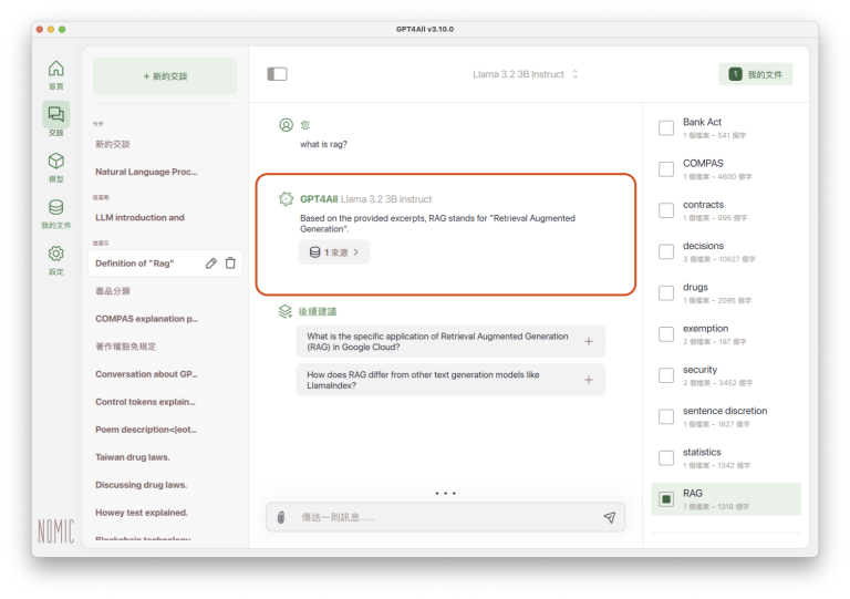 前文介紹了GPT4All 的下載、安裝、以及大型語言模型(LLM)的下載說明,本文將簡介GPT4All的基本操作方式、以及GPT4All本機端RAG的使用方式。