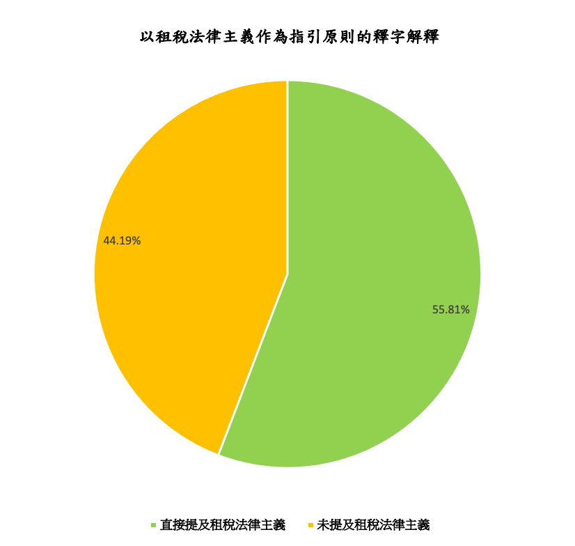在全部129則涉及租稅法令的釋字解釋中,總計有72則在解釋理由中直接提及憲法第19條或租稅法律主義作為主要的指引原則、或其中之一的指引原則,比例為55.81%。