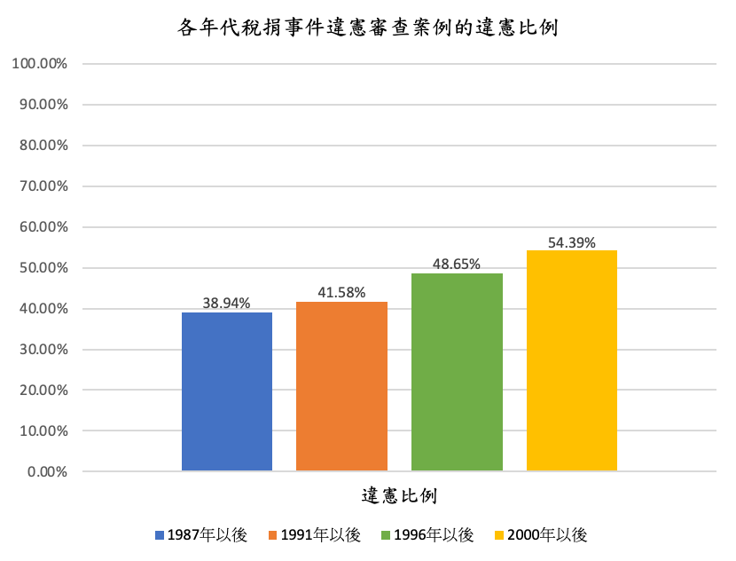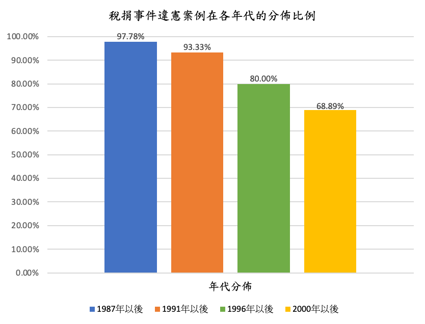 從1949年起至2021年止,在129則與稅務法令有關的釋字解釋之中,解釋日期在1987以前的案例,只有16則(12.40%),將近九成(87.60%)的稅捐違憲審查案例,是在1987年解嚴之後才做成解釋;即使將時間稍微往後移至1991年終止動員戡亂時期、制定公布憲法增修條文之後,也將近八成(78.29%),再往後延至1996年第一次總統直選之後,仍然超過半數(57.36%)。